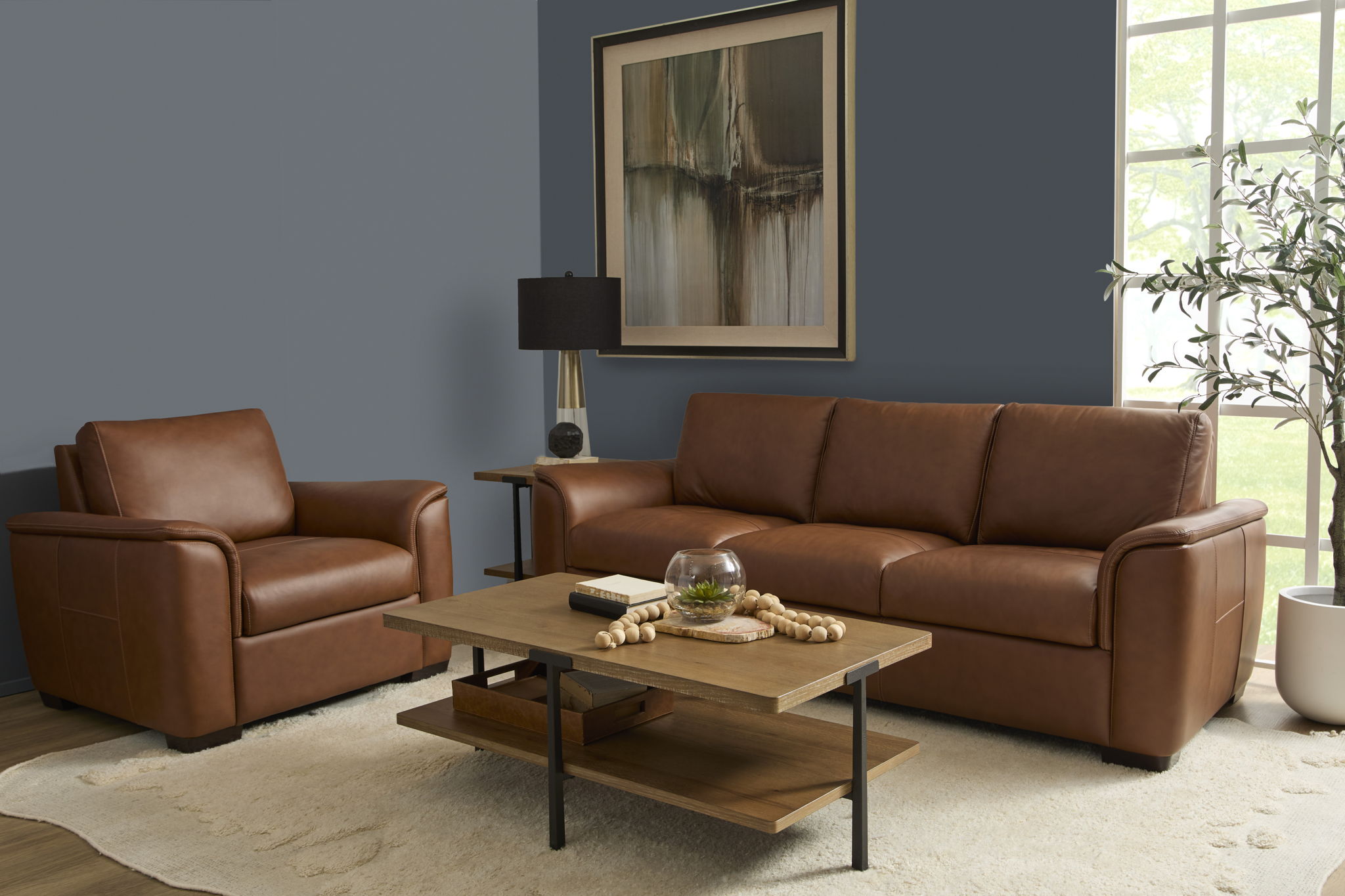 - Upholstered in a caramel brown premium top-grain leather that is durable for everyday use