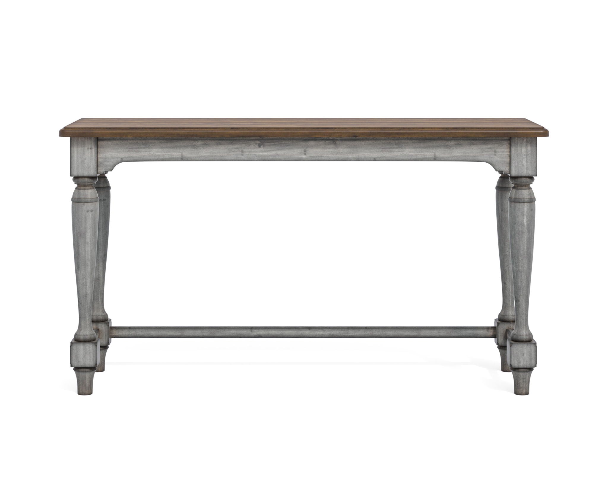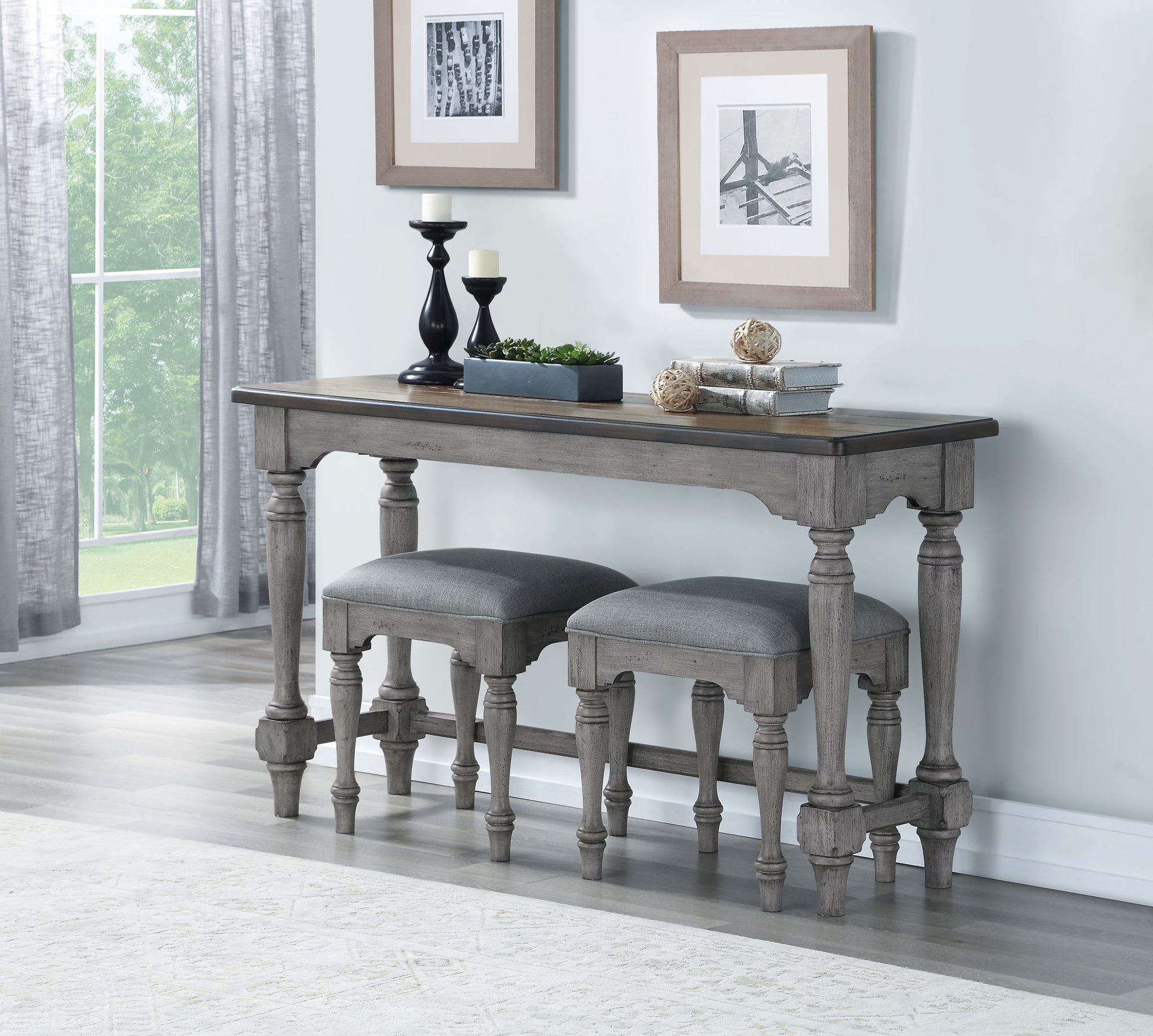 - Distressed graywash finish with medium brown top
