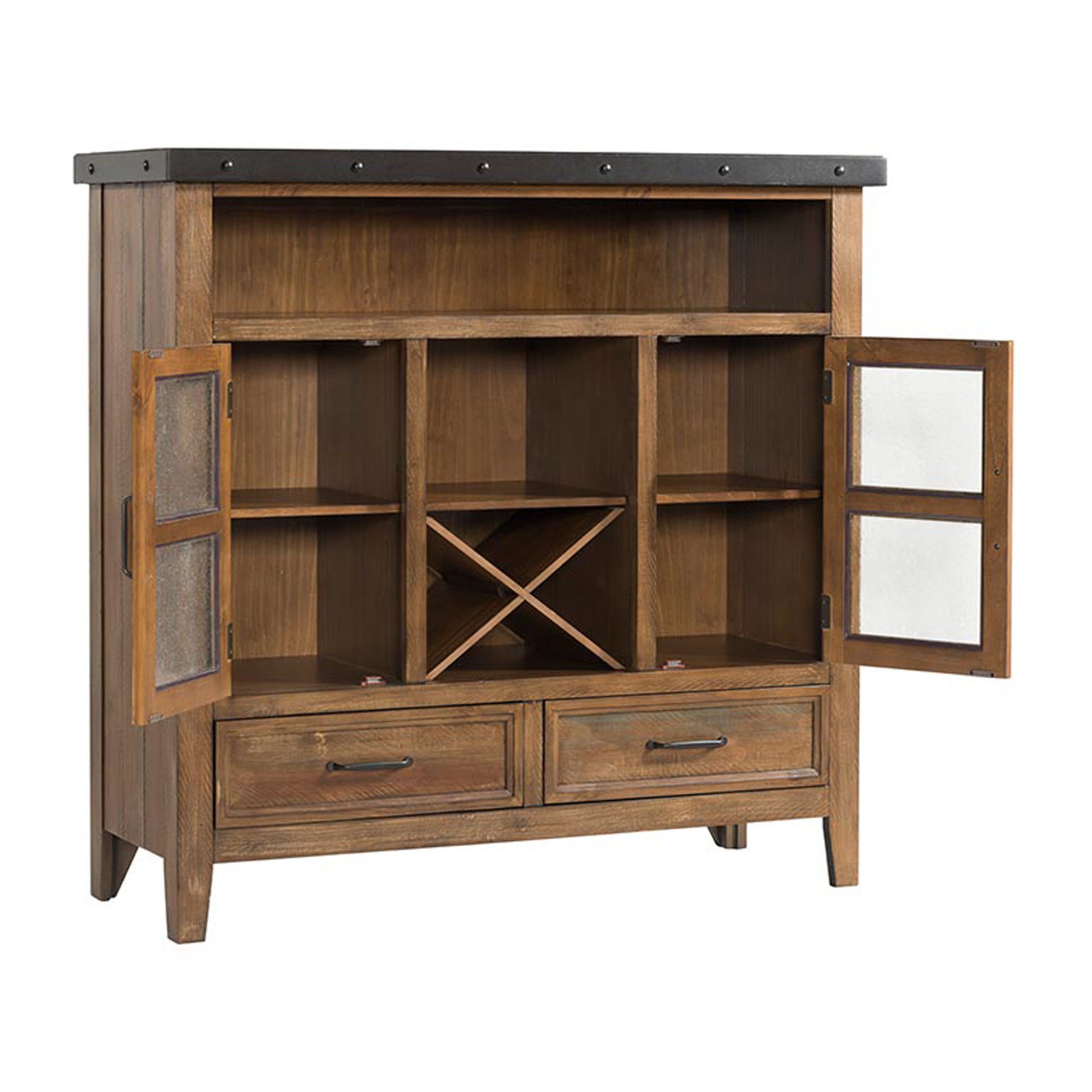 - Beveled glass in both cabinets